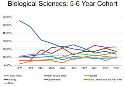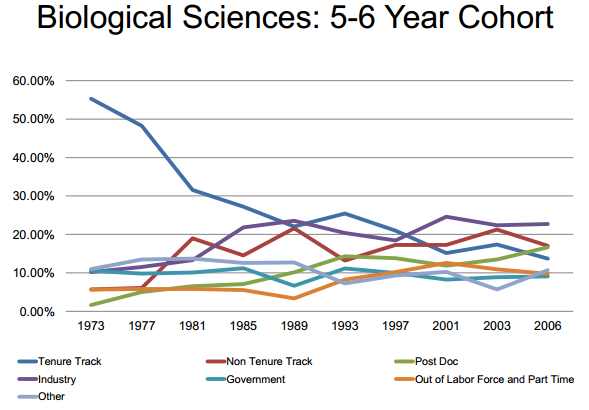 It used to be that more than half of biology doctorates got tenure track jobs in universities. Now that figure is closer to 15%. In general, most people who get doctoral degrees are using them in ways related to their work, but a doctoral degree looks less like a pathway to a career and more like a spin of the roulette wheel.