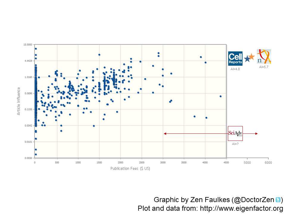 I’m intrigued by all this because the open access “baby journals” that share the name of a paywalled glamour magazine (Science, Nature, Cell) seem to be able to charge prices that are well above the market for most open access journals. To reuse yesterday’s graph, they all break the axis: