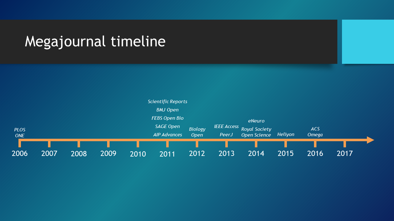 Second, we have journals that, while not specifically created to accept negative results, specifically include publication of negative results in their editorial mandate. Usually, this is phrased as “reviewed only for technical soundness, not perceived importance,” and these have become known as “megajournals” (regardless of how many papers they actually publish). This format, pioneered by PLOS ONE, is still quite new. Several megajournals are less than five years old (click to enlarge pic below).